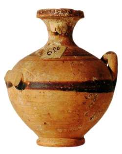 Alabastron conico etrusco-corinzio a fasce con cani in corsa
