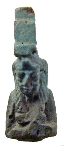 Amuleto in faience raffigurante Sekhmet seduta con pilastro dorsale, dall'Egitto