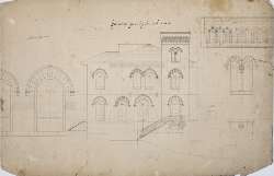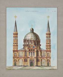 Progetto di chiesa in stile romanico con pianta a croce latina, con campanile posteriore