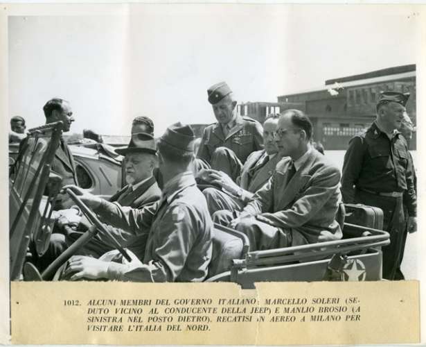 ALCUNI MEMBRI DEL GOVERNO ITALIANO: MARCELLO SOLERI (SEDUTO VICINO AL CONDUCENTE DELLA JEEP) E MANLIO BROSIO (SINISTRA DIETRO), RECATISI IN AEREO A MILANO PER VISITARE L'ITALIA DEL NORD.