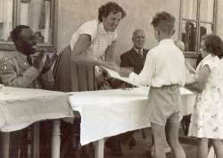 Consegna di attestati ad alcuni bambini, con autorità civili e militari