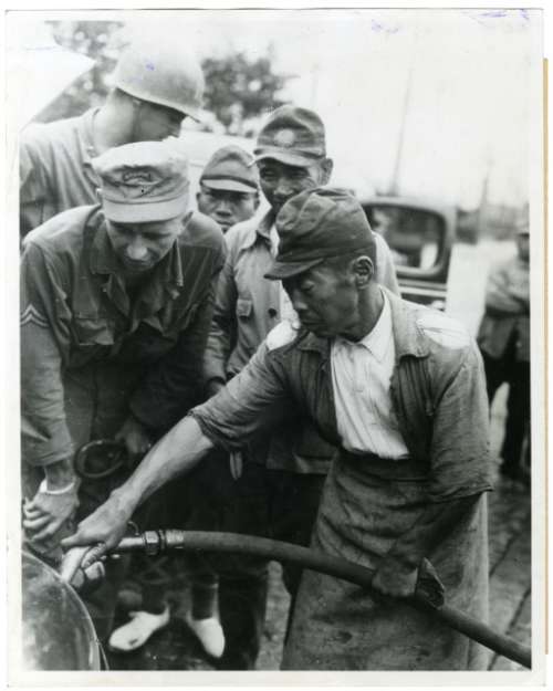Japanese soldier provides fuel for vehicle used by U. S. troops