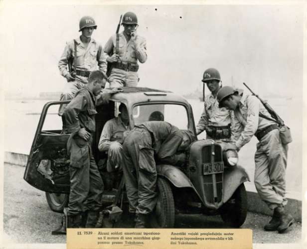 U. S. Army airborne troops repair japanese automobile on Yokohama