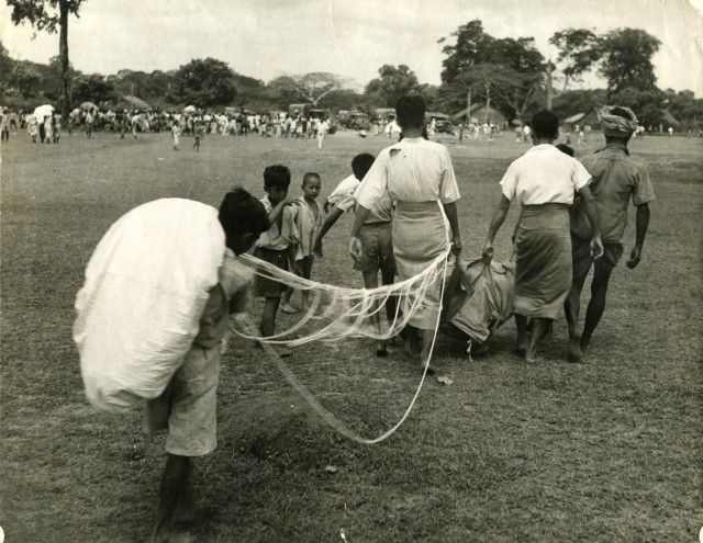 Burmans work wherever planes drop supplies. In Rangoon, locals help on distribution and storage after an air drop