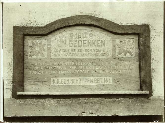 Dank des Korposkomdt (8. Korp.) : F. U. Lt. Scharitzer, Div. G. Mjr. Schonauer, Brigd. Obst. Moritz Kranz, Offiziere ... 44. Sch. Brigd. ... Zenson, Hptm. Paulus (Kr. Ord.); Oblt. Mukl (2. pilt. Sign.); Oblt. Sorko (Kr?), Oblt. Haslinger (v. Kr.), Oblt. Ziegler; Oblt. Niedermuller (v. Kr.), Oblt. Opl; Oblt. Petruha; Lt. Wuhr, Lt. Dangl