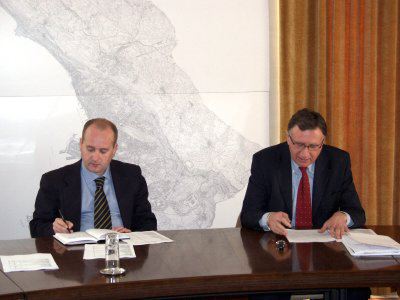 Roberto Dipiazza sindaco e Giorgio Rossi assessore presentano il progetto per la riasfaltatura delle strade del centro : Trieste : 2003