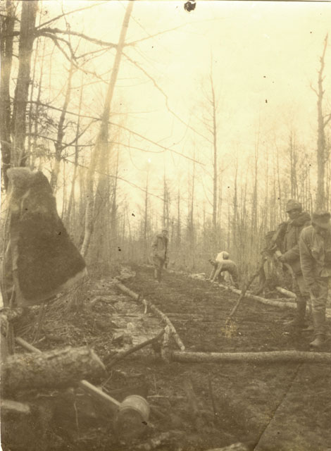 Lo squadrone tecnico costruisce una strada con tronchi d'alberi : Volinia : 2 novembre 1915