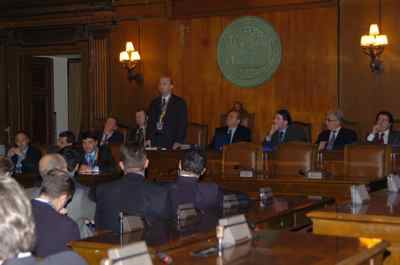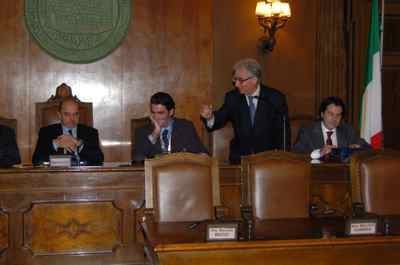 Il sindaco Roberto Dipiazza ed il Presidente del Consiglio comunale Bruno Sulli ed l'assessore comunale Maurizio Bucci con il presidente di Round Table Italia Maurizio Giudici e gli altri rappresentanti presenti al Meeting organizzato dalla Round Table Italiana in collaborazione con il Comune di Trieste, durante l'incontro avvenuto nella sala del Consiglio del Municipio.