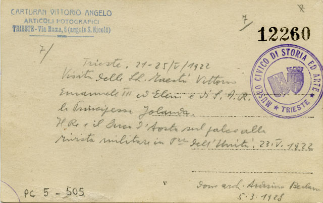 Vittorio Emanuele III, la regina Elena e la principessa Iolanda alla rivista militare in piazza dell'Unità d'Italia il 23 maggio 1922. Vi si vedono il Re e il Duca d'Aosta sul palco allestito in piazza.