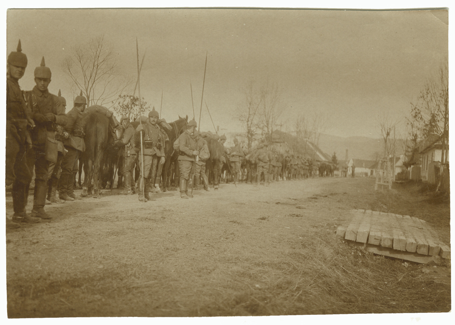 Dall'iscrizione sul verso dovrebbe trattarsi del 3. Eskadron/Kgl. Bayerisches 4. Chevauleger-Regiment König, del Deutsche Alpenkorps, una divisione tedesca addestrata per la guerra in montagna, composta per la maggior parte da truppe bavaresi e prussiane, dotata di artiglieria, truppe tecniche e di una squadriglia aerea, e considerata una delle migliori unità dell'Esercito tedesco. Vennero inviati sul fronte romeno nel settembre 1916 e vi rimasero fino all'aprile 1917, subendo molte perdite tra cui quella del maggiore principe Heinrich di Baviera.