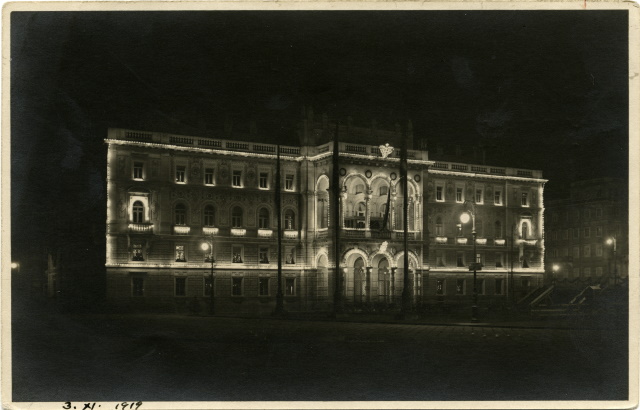 Illuminazione notturna del palazzo della Prefettura in occasione del I anniversario della redenzione di Trieste