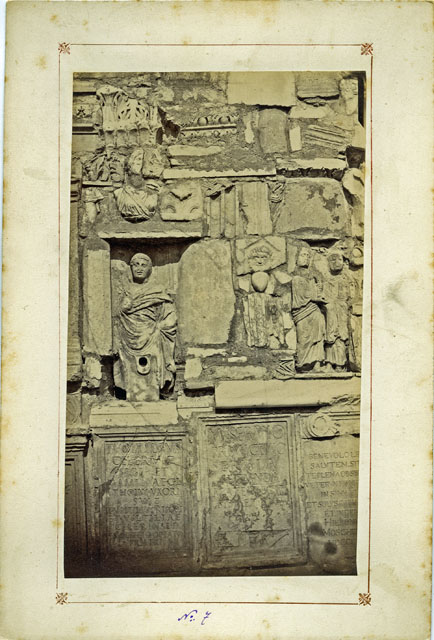 Particolare della facciata della cosiddetta "stalla" Moschettini costruita ad Aquileia nel 1824 da Gerolamo de Moschettini, funzionario del governo austriaco preposto alla tutela del materiale archeologico rinvenuto in città. Il fabbricato si caratterizzava per almeno due facciate costipate di rinvenimenti archeologici quali iscrizioni, statue, colonne, ma non solo, murati in modo affastellato e con accostamenti improbabili. Oggetto di un lungo contenzioso con le Autorità, che contestavano al proprietario di essersi appropriato illecitamente di beni pubblici, la stalla venne demolita nel 1887 e i reperti in essa murati confluirono al museo locale. Per un più ampio inquadramento dell'opera e delle vicende che la videro protagonista si rimanda alla scheda della fotografia F17174.