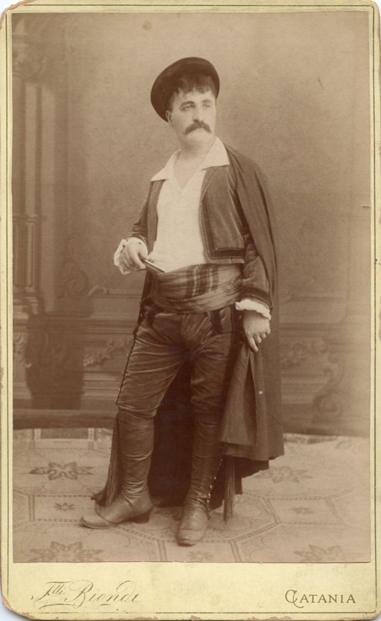 In costume. Il tenore ha cantato a Catania nel 1889, la fotografia può essere stata scattata allora. Al Politeama Rossetti di Trieste si è esibito nel 1887 in "La forza del destino", "Ernani" e "La favorita" e nel 1889 in "Carmen". Esordio nel 1878 a Pisa, emigra nel 1894 negli Stati Uniti, cantò alla Grand Opera House di New York in Cavalleria Rusticana, Carmen e Pagliacci. L'anno successivo fu all'Opera di Boston in Cavalleria Rusticana. Si esibì regolarmente almeno fino al 1903 accettando di ritornare sulla scena nel 1915 con un concerto alla Century Opera House di New York. Nel 1900 aperta a New York un a scuola di canto, si dedicò alla formazione di nuovi talenti.