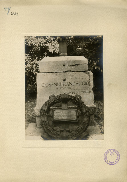 Tomba monumentale di Giovanni Randaccio (1884-1917) presso il Cimitero degli Eroi di Aquileia. Capitano di fanteria sul fronte carsico, G. Randaccio fu compagno e amico di Gabriele D'Annunzio, con il quale fronteggiò le battaglie dell'Isonzo. Morì durante la Decima battaglia dell'Isonzo nel tentativo di occupare le rovine del castello di Duino, posto oltre il corso del Timavo. Fu sepolto ad Aquileia e fu D'Annunzio stesso a idearne l'epitaffio "vitam dedit Timavo" inciso ai piedi del monumento, forse ispirandosi all'epigrafe romana scritta nel 129 a.C. per commemorare la vittoria sugli Istri, oggi conservata al Museo Archeologico Nazionale di Aquileia.