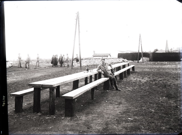 Soldato austriaco ad Aurisina seduto su una panca in un momento di riposo durante la prima guerra mondiale.