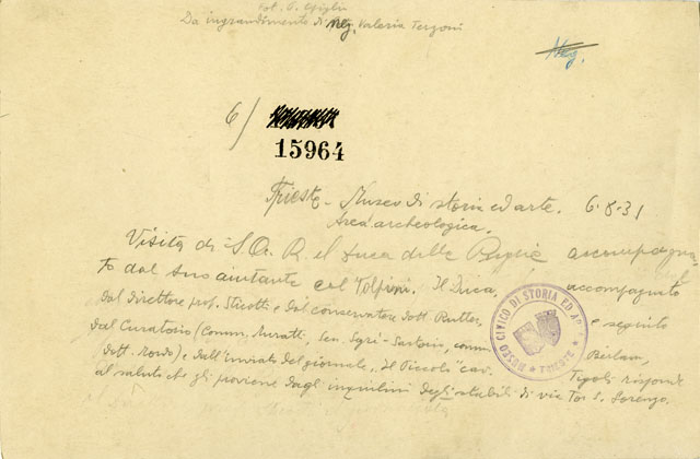 Sua Altezza reale il duca della Puglia visita l'area archeologica del Museo di Storia ed Arte di Trieste in data 8 giugno 1931. Lo accompagnano il suo aiutante colonnello Volpini, il direttore del Museo professor Sticotti e il conservatore dottor Rutter. Con lui anche il Curatorio (comm. Muratti, sen. Sagrè Sartorio, comm. Berlam, dott. Mordo) e l'inviato del giornale "Il Piccolo" cavalier Tigoli.Il Duca è ripreso mentre risponde al saluto degli abitanti degli edifici affacciati su via Tor San Lorenzo.