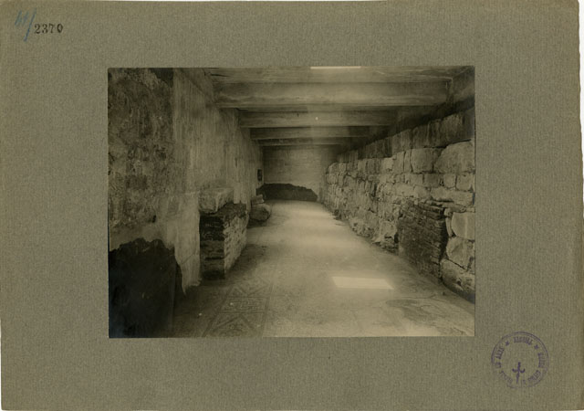 Aula Nord della Basilica teodoriana di Aquileia costruita dal Vescovo Teodoro all'inizio del IV sec. d.C., poco dopo l'editto di Costantino (313 d.C.)./pLa foto ritrae la porzione orientale dell'aula contraddistinta da un pannello musivo con composizione ortogonale di ottagoni delineati adiacenti (formanti quadrati), con gli ottagoni campiti da motivi figurati e vegetali. In particolare, nella foto si intravede sulla destra l'ottagono decorato con la scena della lotta tra il gallo e la tartaruga presso un pilastro sormontato dal vaso della vittoria./pIl pavimento è interrotto sulla destra dalle fondazioni del campanile, costruito in un'epoca successiva dal patriarca Poppone (inizio dell'XI secolo)./pI resti dell'aula nord furono messi in luce negli anni della prima guerra mondiale e poco dopo la fine del conflitto furono protetti da una copertura in cemento armato.