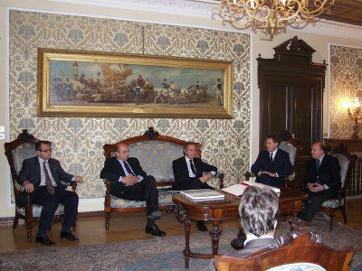 Il sindaco Roberto Dipiazza con l'ambasciatore Francesco Caruso durante l'incontro nel Salotto azzurro del Municipio. Presenti anche l'assessore Franco Frezza ed il consigliere Piero Tononi