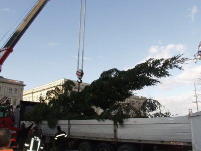 Operazioni per la posa dell'albero di Natale in piazza Unità d'Italia.