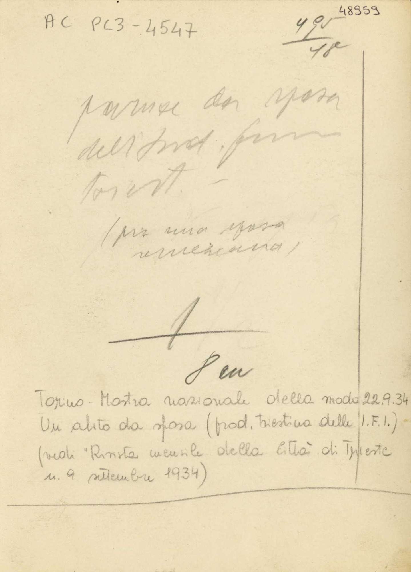 Il comitato delle patronesse presieduto da Eleonora Salem propone di far partecipare Trieste alla IV Mostra nazionale della moda di Torino con uno stand. Tra i capi proposti, alcuni modelli di Anita Pittoni, la biancheria e i merletti di Maria Debrazzi e i disegni e i bozzetti di vari artisti del Sindacato delle belle arti. La presidente Salem con la marchesa Enrichetta Bourbon del Monte partecipa all'inaugurazione.