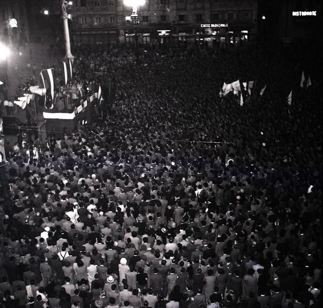 In vista delle elezioni del 25 maggio, si svolge un comizio con i partiti dell'apparentamento democratico: il Partito socialista della Venezia Giulia, con l'on. Zagari, il Partito repubblicano italiano, col ministro Pacciardi, il Partito liberale italiano, con l'on. Sanna Randaccio e la Democrazia Cristiana, col ministro Pella.
