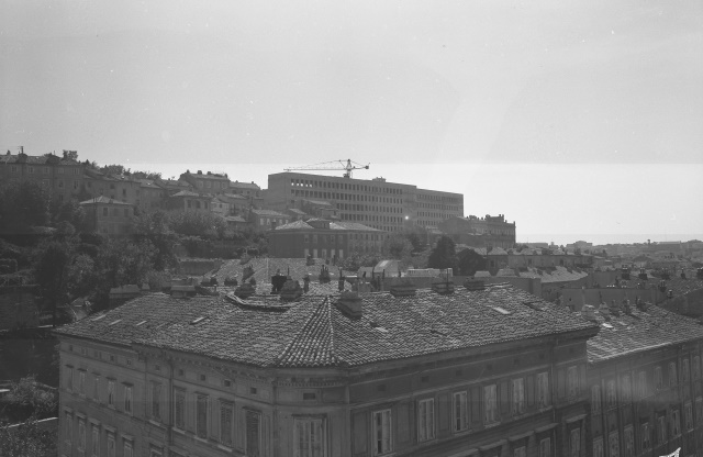 Il nuovo Poliambulatorio INAM di via Farneto fotografato da via Kandler. Il poliambulatorio presenta un innovativo impianto planimetrico a L. Sul retro: il sanatorio immerso nel giardino, sulla strada i sette piani destinati all'ambulatorio.