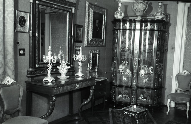 La splendida camera da letto di Draga Obrenovic, regina di Serbia, moglie del re Alessandro, composta da mobili olandesi intarsiati d'avorio. Draga e Alessandro, convolati a nozze nel 1900, furono assassinati la notte del 10 giugno 1903, proprio in questo letto: una congiura di palazzo pose fine alla dinastia degli Obrenovic, per insediare sul trono Pietro Karageorgevic. La camera appartenne a una nobile famiglia triestina e fu poi venduta a un celebre antiquario che la riallesti in una villa di viale Terza Armata, dove fu fotografata.