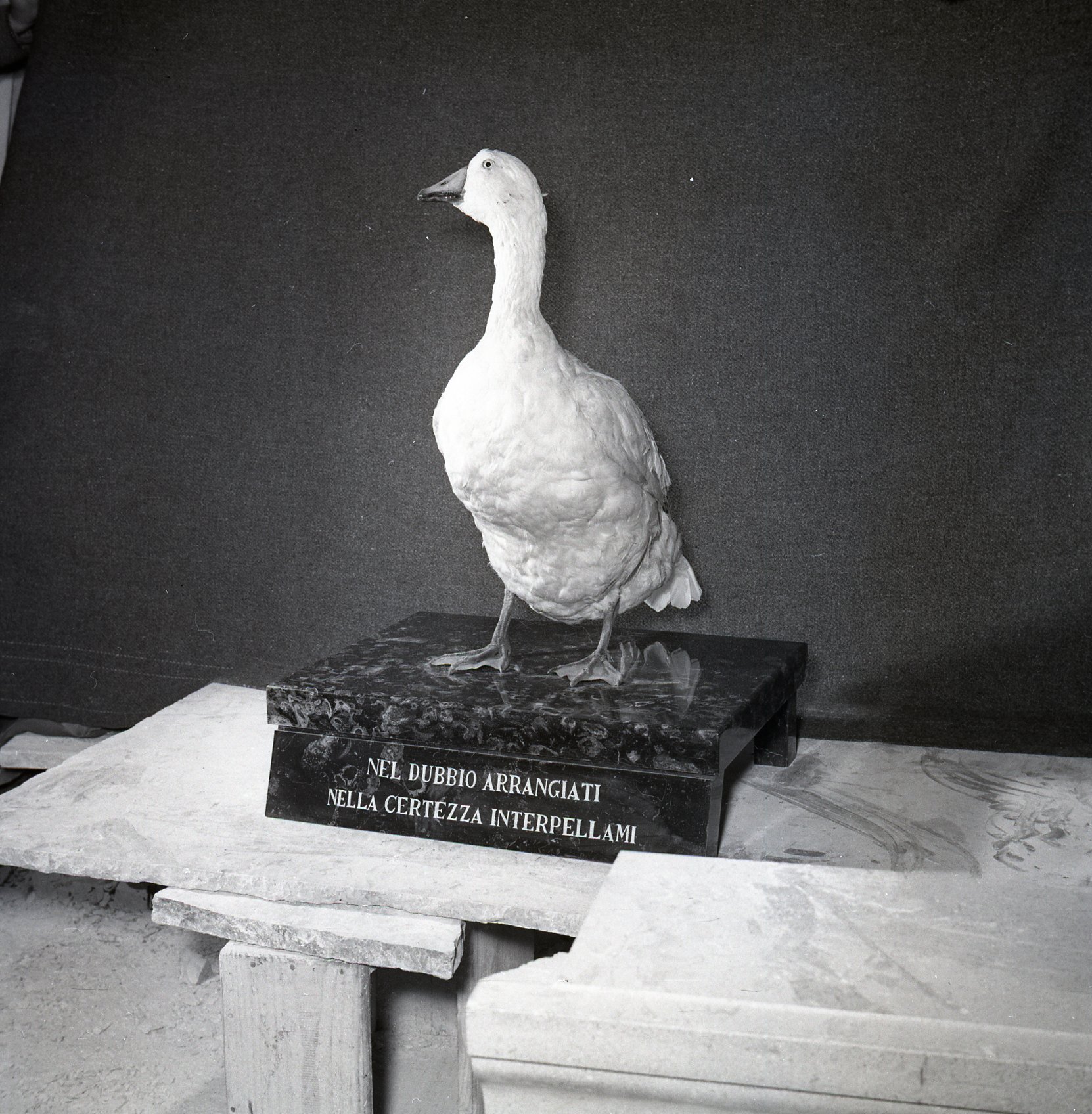 Ripresa di un'oca imbalsamata. Sulla base un'iscrizione: Nel dubbio arrangiati, nella certezza interpellami