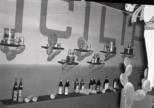 Riprese di uno stand di prodotti siciliani allestito con il tipico carretto, dello stand della Lykes Lines e del chiosco della Stock