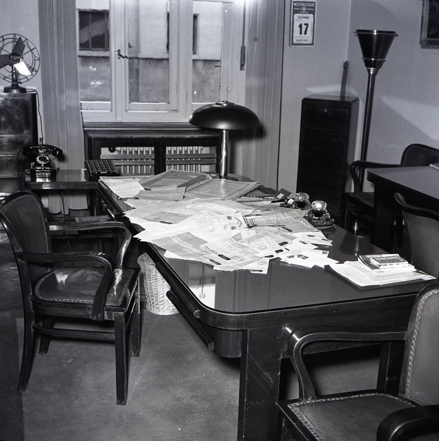 Documenti di lavoro sparpagliati su una scrivania. Gruppo di impiegati in posa all'interno di un ufficio. Pergamena celebrativa per il 40. di lavoro del direttore