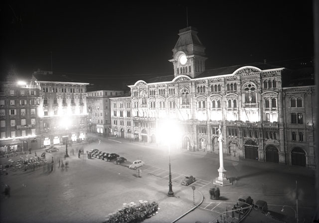 Quattro notturni di piazza Unita' d'Italia, con il palazzo del Municipio illuminato, la sera della vigilia della firma a Londra del Memorandum d'intesa.