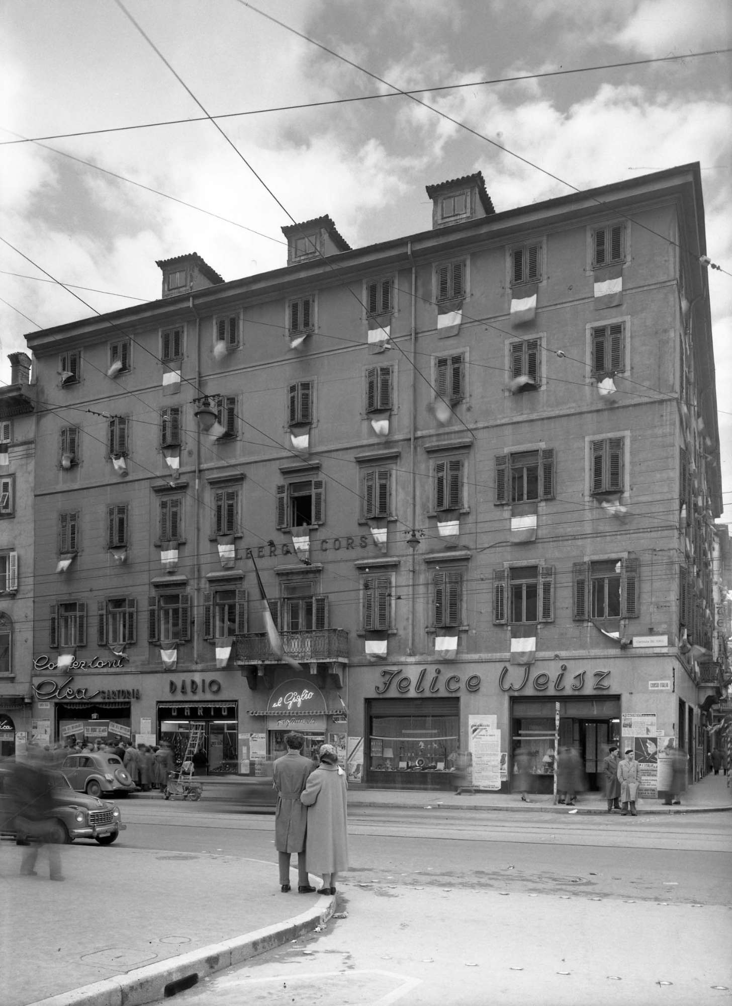 Bandiere italiane alle finestre dell'albergo Corso.