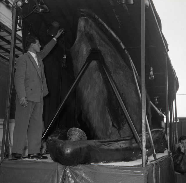 La gigantesca balena Golia, tra i più grandi esemplari al mondo, catturato nei mari della Norvegia ha una lingua che pesa quanto un elefante, ossia 2200 kili, un cuore di cinque quintali e mezzo e il peso di 62.000 kili, è lunga 22 metri. Il gigante degli Oceani viene esposto per quattro giorni, dal 6 al 9 novembre in Riva Nazario Sauro, vicino alla Pescheria. Testo tratto da Il Piccolo, 6.11.1954