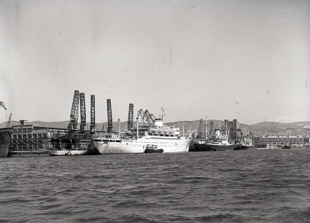 Vista del porto Duca d'Aosta con ormeggiate molte navi : Africa, Risano, Sebastiano Caboto (tutte di proprieta' del Lloyd Triestino di navigazione) e Etna.