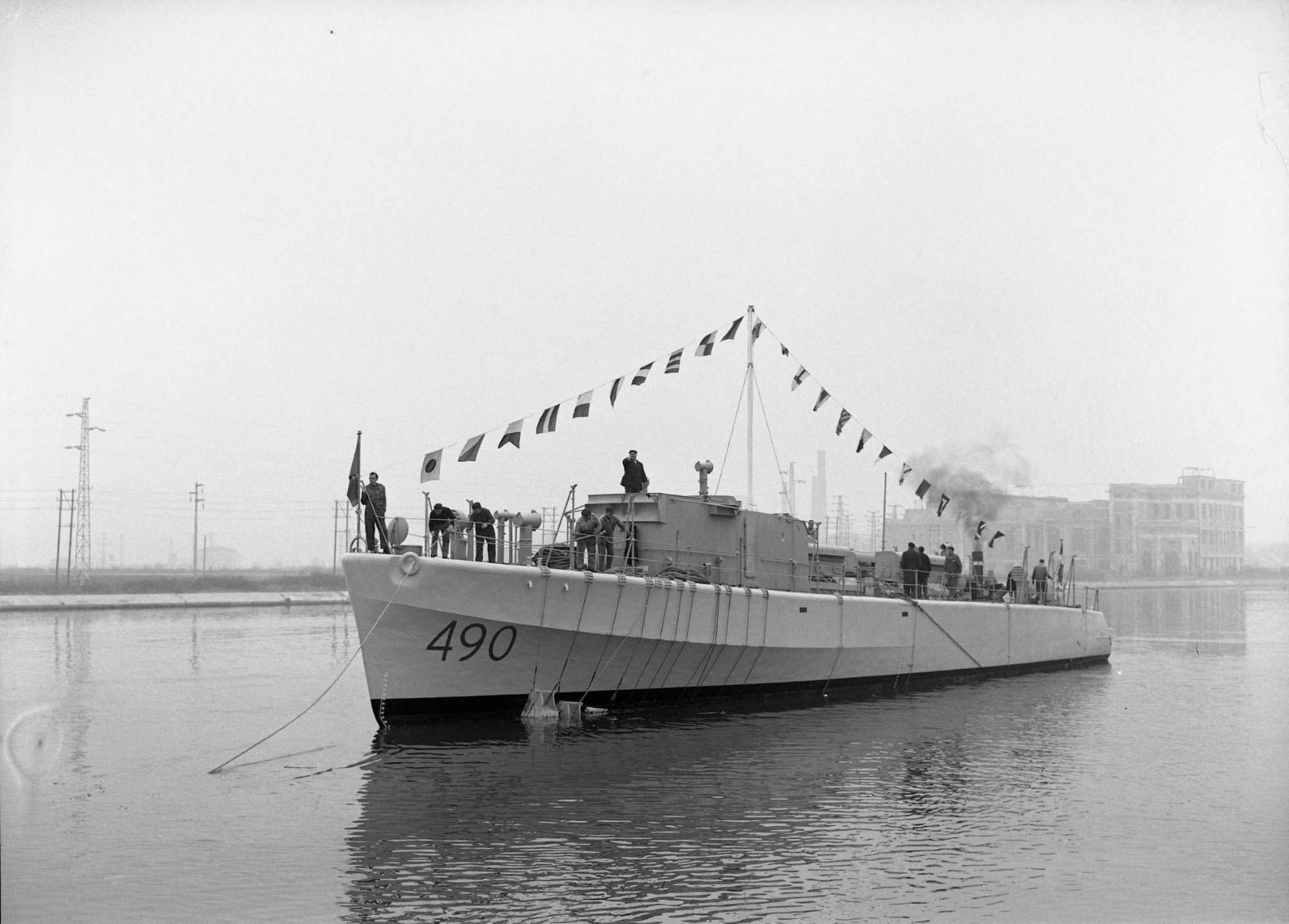 Varo della moto cannoniera MC 490 nei cantieri di Monfalcone.Tra le unita' minori commesse dalla Marina militare italiana a cantieri italiani, nel programma di potenziamento navale avviato nel 1950, dopo l'ingresso dell'Italia il 4 aprile 1949 nella NATO, vi e' questa motocannoniera che fu un banco di prova per la sperimentazione di idee e soluzioni tecniche. Non avendo dato le prove l'esito sperato, dopo varie trasformazioni assunse nel 1956 la configurazione di motosilurante e venne ribattezzata Folgore.