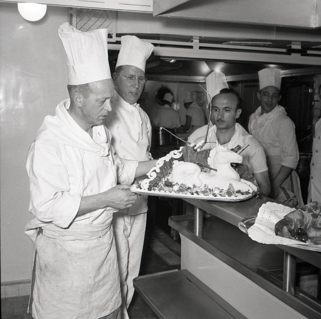 Croceristi ripresi sulla nave. Gli interni della Motonave Victoria: la cucina, il ristorante, la sala da ballo.