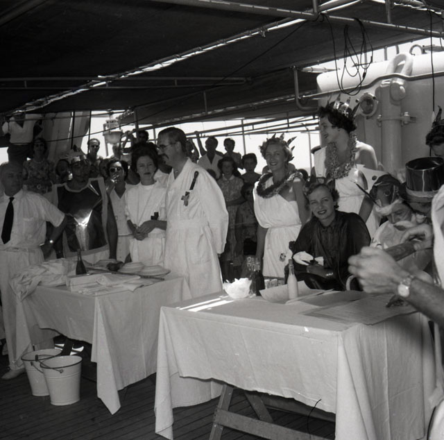 Passeggeri ripresi sulla nave e ritratti del personale di bordo. Gli interni della Motonave Africa: la piscina, la sala da pranzo.