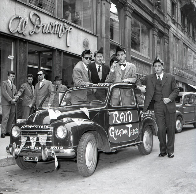 A bordo di una Giardinetta, quattro goliardi dell'Ateneo barese (Sandro e Piero De Riccardis, Giacomo Viva ed Enzo Caglio) hanno compiuto il raid Galatina, Napoli, Roma, Siena, Firenze, Bologna, Padova, Trieste. Tratto da Il Piccolo, 12-13 aprile 1955