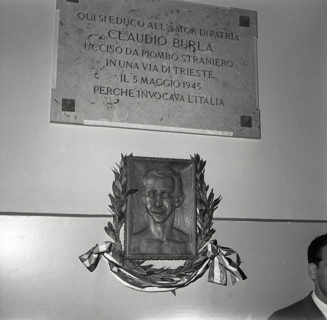 Scoprimento di una lapide, all'interno dell'istituto magistrale Amedeo di Savoia duca d'Aosta, dedicata alla memoria di un ex studente, Claudio Burla.Il 5 maggio 1945, il 21enne Claudio Burla, mentre manifestava in nome dell'italianità di Trieste in via Imbriani, veniva falciato, insieme ad altri quattro triestini, dal fuoco delle truppe jugoslave. Morirà quattro giorni più tardi. Il 25 marzo 2006 a tutti e cinque verrà conferita la Medaglia d'oro dal Presidente della Repubblica Ciampi.