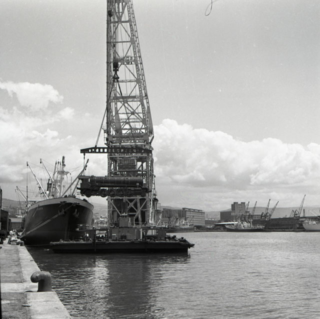 Dal Molo quarto la gru pontone Ursus carica tre locomotive austriache sulla nave Ambra del Lloyd triestino, in partenza per l'India.