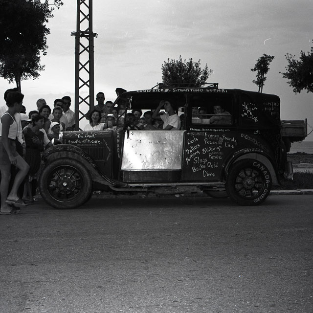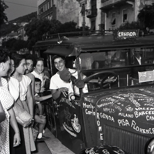 Alcune ragazze canadesi giungono a Barcola a bordo di una vecchia automobile. Sulla carrozzeria compaiono numerose scritte a testimonianza delle tappe toccate dal loro tour.
