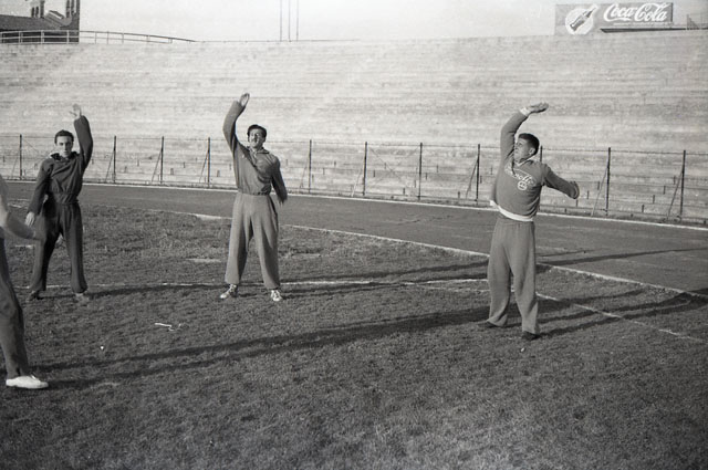 Il giornalista Dante di Ragogna, gia' capo dei servizi sportivi de Il Piccolo, intervista il ciclista Guido De Santi in allenamento con la U.S. Triestina calcio