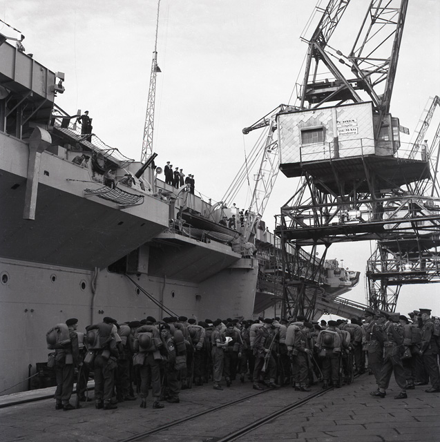 Alla vigilia dell'arrivo dei soldati italiani le ultime truppe britanniche si imbarcano, unitamente ai loro mezzi, su una portaerei, ormeggiata poco distante dall'idroscalo (da: Ugo Borsatti, Trieste 1954, fotografie dell'Archivio Storico "Foto Omnia" di Ugo Borsatti di proprieta' della Fondazione CRTrieste, Trieste, Lint, 2004, p. 66-67).