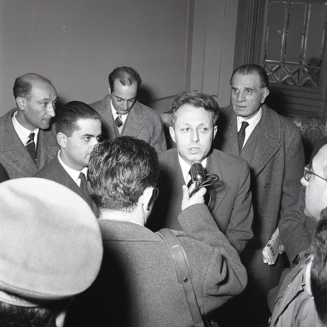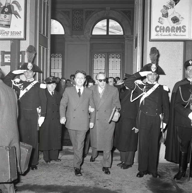 Mario Martinelli (Como, 12 maggio 1906 - 21 maggio 2001), senatore della Repubblica, deputato della Costituente, per sei volte ministro, fu esponente del Partito Popolare prima e della Democrazia Cristiana in seguito. Nel servizio fotografico Martinelli, ministro del Commercio con l'estero, viene accolto a Trieste dal sindaco Bartoli, reduce da una missione effettuata a Belgrado il 7 e 8 dicembre 1954. Questa missione, in cui si incontrò col vicepresidente jugoslavo Kardely (il maresciallo Tito era in missione di Stato in India), determinò un'autentica svolta nelle relazioni fra Italia e Jugoslavia che si concretizzò nell'accordo per la stipula di un nuovo trattato commerciale