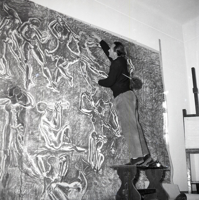 Si tratta in realtà del cartone dell'affresco, con scene di danza con satiri e altre figure mitologiche, che decorava l'atrio del Teatro Nuovo di via Giustiniano a Trieste, sede della Compagnia stabile di prosa, che iniziò la sua attività' il 22 dicembre 1954. Si dice che Righi, coadiuvato dal pittore Carlo Giorgio Titz, abbia eseguito l'affresco in un giorno e una notte. Purtroppo l'opera andò perduta durante i lavori di demolizione dell'edificio, nel 1962, per far posto alla costruzione della sede Rai. Al pittore Riccardo Bastianutto, incaricato di eseguire lo strappo, non arrivò mai il permesso da parte delle autorità competenti.