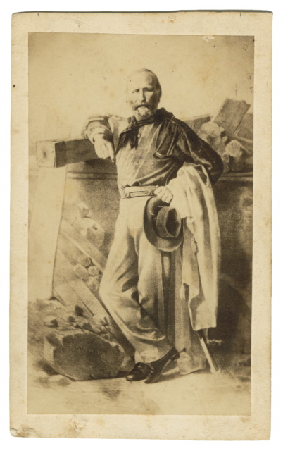 Il personaggio è raffigurato a figura intera ed è posto leggermente verso sinistra con il busto voltato frontalmente, un braccio è appoggiato su un ripiano da cui sporge una trave e una mano tiene il cappello: indossa la camicia garibaldina con un fazzoletto annodato attorno al collo e calzoni bianchi fermati da una stretta cintura; è in piedi, accanto una pietra.