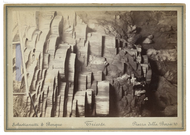 Fotografia eseguita con luce artificiale posizionando una carica di "Blizlicht" (polvere flash al magnesio) in un punto in basso a sinistra della veduta che ritrae le celebri "Fontane" ovvero le monumentali vasche di stillicidio della Grotta. La luce artificiale violenta, difficile da calibrare, ha sovraesposto una zona della lastra fotografica per cui il fotografo ha ritoccato il positivo con parti disegnate a china. I bordi in ombra, troppo scuri, delle vasche sulla sinistra sono stati invece allegeriti con una punta abrasiva.