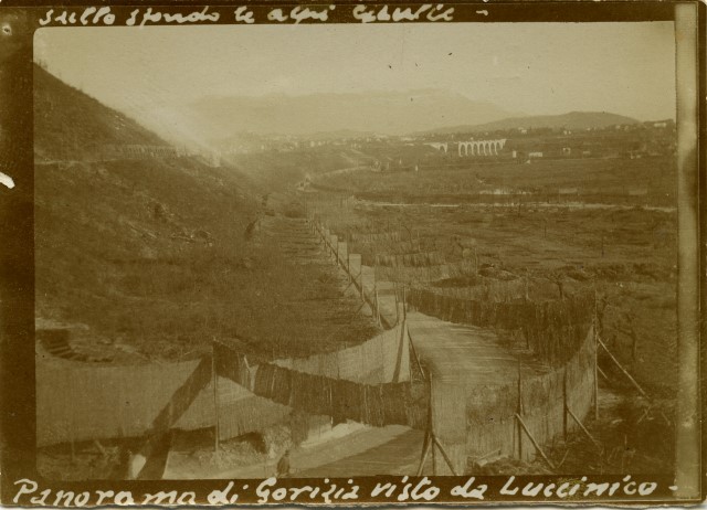 Il ponte ferroviario che corrisponde alla descrizione è il Ponte di Salcano (oggi Ponte di Solkan in Slovenia) sull'Isonzo. Durante la Sesta Battaglia dell'Isonzo nell'agosto 1916, le truppe austro-ungariche in ritirata lo fecero esplodere, distruggendone una campata per impedire l'avanzata italiana. Dopo la conquista di Gorizia, venne ripristinato in modo temporaneo con una struttura metallica, per poi essere ricostruito nella sua forma originale in pietra solo a fine guerra, rendendolo il ponte in pietra ad un arco più lungo del mondo. Panorama di Gorizia ripreso da Lucinico. Sullo sfondo il ponte ferroviario sull'Isonzo con una campata distrutta.