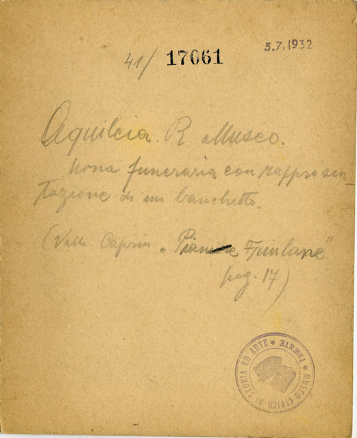 Cippo funerario in calcare di Aurisina che imita un cesto di vimini nei cordoli posti alla base e nella parte superiore, a cui si somma una decorazione a bacellature che rimanda invece alla lavorazione in terracotta o in bronzo.Nella porzione centrale si svolge una scena di banchetto funebre all'aperto, come sembrano suggerire le assi lignee riprodotte sullo sfondo. La raffigurazione è resa in modo realistico: attorno a un tavolo rotondo si colloca il letto tricliniare sul quale giacciono reclinati, sorretti con il braccio sinistro, i convitati, due coppie composte da un uomo e una donna. Nella porzione retrostante, non visibile nella foto (cfr. F17187), completano la scena un musico che suona il doppio flauto, un servo che porta un paniere di frutta e un'ancella intenta a preparare le bevande e i tovaglioli.La scena è connotata da notazioni reali e da dettagli veristici, evidenziati dal gesto di scongiuro della donna di destra e del servo, che rappresenta una reazione spontanea a qualcosa che è stato detto o fatto probabilmente da uno degli altri convitati. È possibile che l'urna non venne mai usata in quanto la tabella posta sotto al tavolo, che solitamente reca l'iscrizione funeraria, è invece vuota. L'opera è databile alla fine del I sec. a.C.La fotografia è stata utilizzata da V. Scarpa per realizzare il disegno pubblicato nel volume di Caprin, "Pianure friulane" (1892).