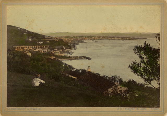 Panorama con Barcola, ancora indenne dall'espansione urbanistica, e, sul fondo, Trieste. Sulla sinistra e' ben visibile il monumentale viadotto della ferrovia (1857) che incombe sui numerosi magazzini e stabilimenti industriali. Si intravede, tra i giardini, la strada litoranea, aperta nel 1859 in seguito alla costruzione del Castello di Miramare, e, nell'arco della costa, il porticciolo di Cedas, costruito su fondamenta romane. Poco sopra si nota il complesso formato dal Bagno Excelsior (1886) e dal palazzetto neogotico chiamato castelletto Cesare (1890), affacciato sullo scalo e sul piazzale alberato, ambedue costruiti dall'arch. Edoardo Tureck per l'imprenditore marittimo Alessandro Cesare. In alto, sul colle di Gretta, si erge il Forte Kressich, importantissimo complesso militare, considerato un gioiello dell'architettura militare dell'epoca, costruito tra il 1854-1857 dall'arch. Karl Moring. Al suo posto, nel 1923-1927, venne costruito dall'arch. Arduino Berlam il Faro della Vittoria, inglobandone nel basamento il torrione principale o rondello